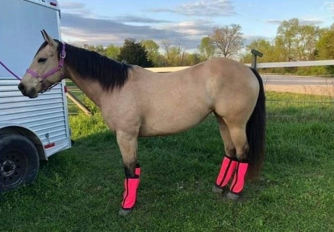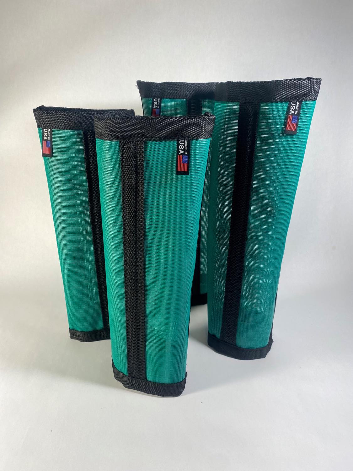 Stomp Stoppers are made of a pliable vinyl mesh with a black binding allowing for breathability and ease of cleaning. Two plastic supports are sewn in vertically to each wrap which prevent sagging and also help form the wrap to sit comfortably on your horses legs. Finally, our wraps have a top to bottom vertical strip of industrial strength hook and loop to allow for a strong hold while on your horse, mule, or donkey.
